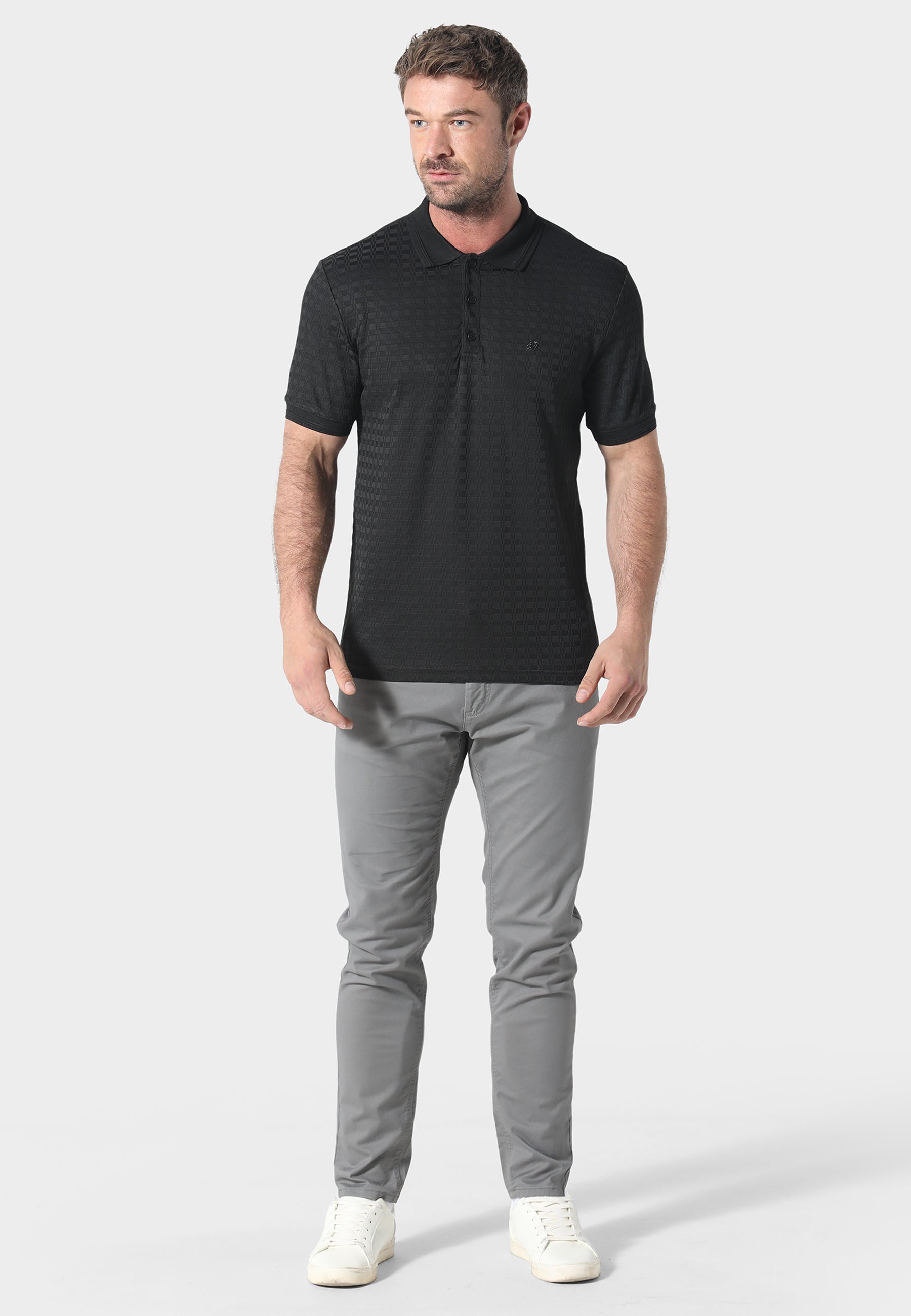 The Penelope Black Polo delivers refined texture and modern style. Crafted with a geometric jacquard pattern, it features a classic three-button placket, soft ribbed collar and cuffs, and a subtle metal chest emblem for a premium finish. A versatile staple perfect for smart-casual wear.
